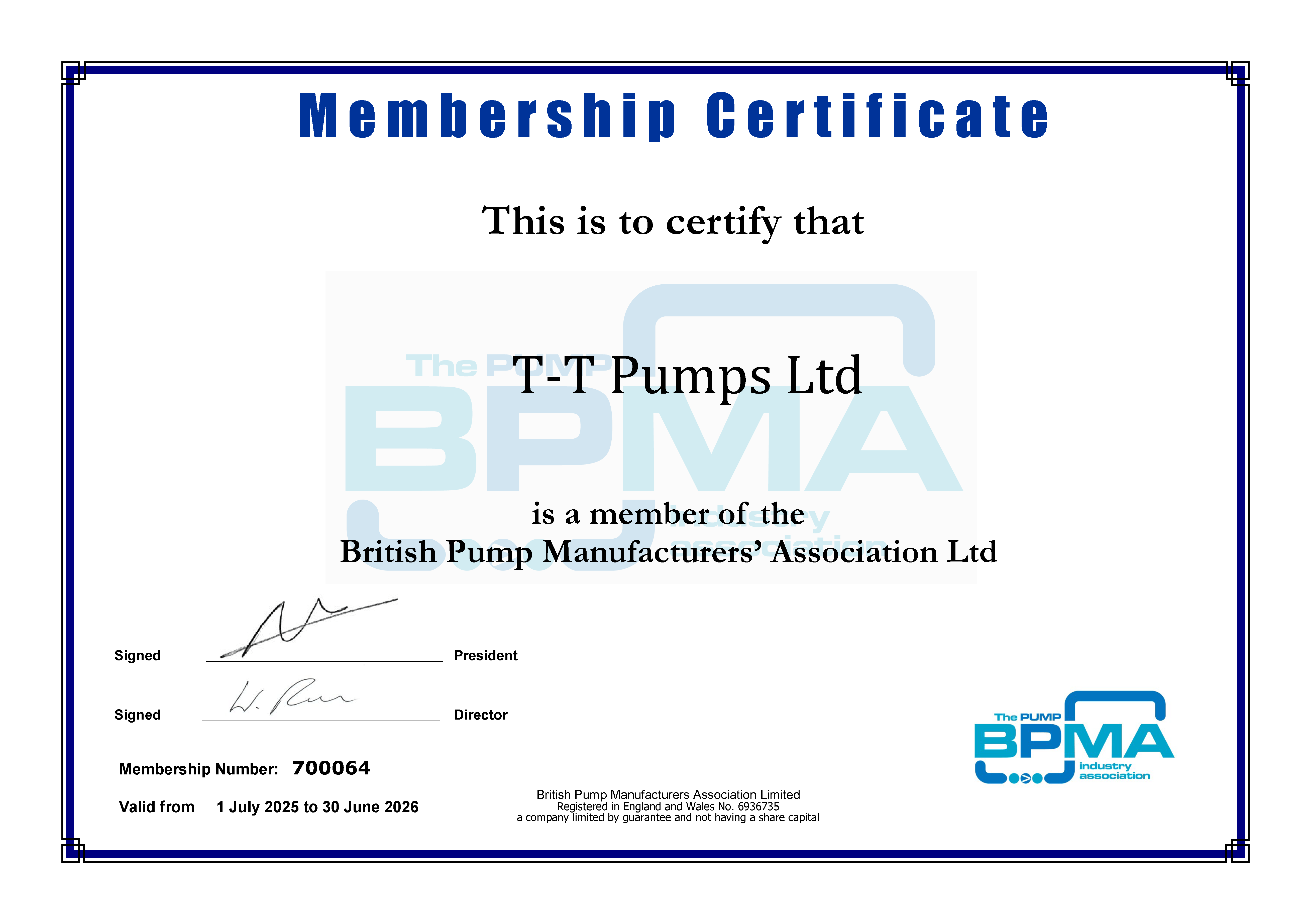 We are pleased to announce that T-T has renewed our membership with the British Pump Manufacturers Association (BPMA) — a key industry body representing the interests of UK and Irish suppliers of liquid pumps and associated equipment.